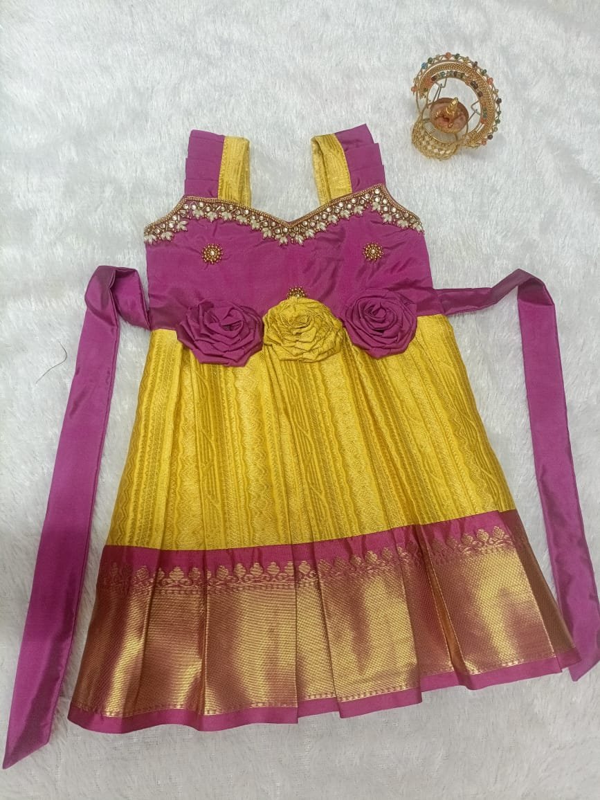 Yellow with Pink combination frock model for your lovely daughter